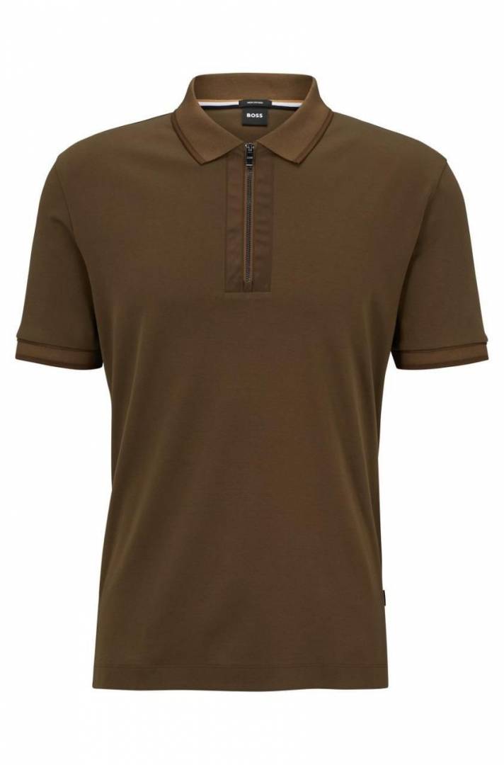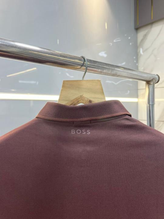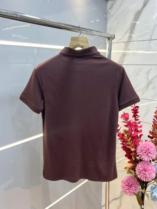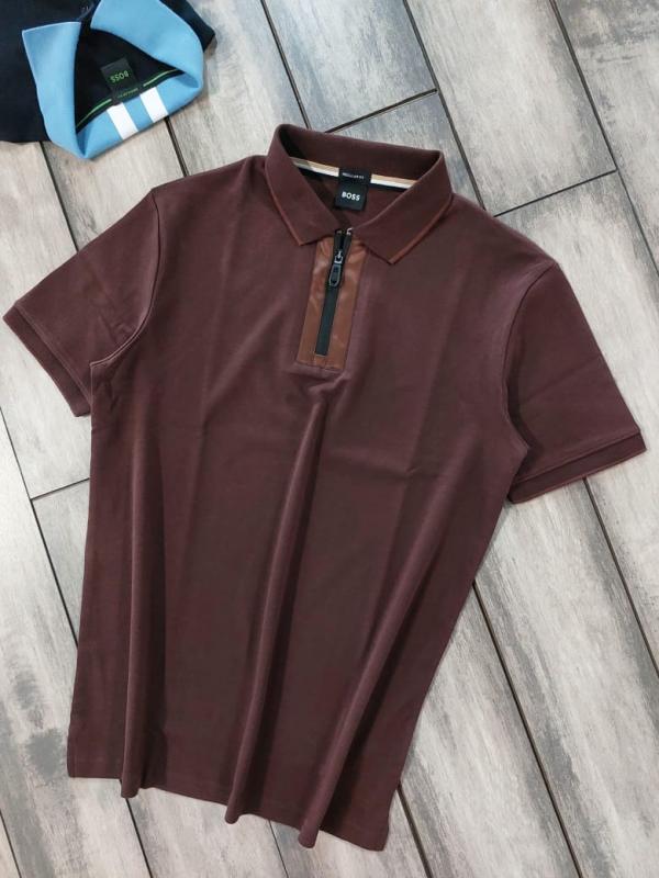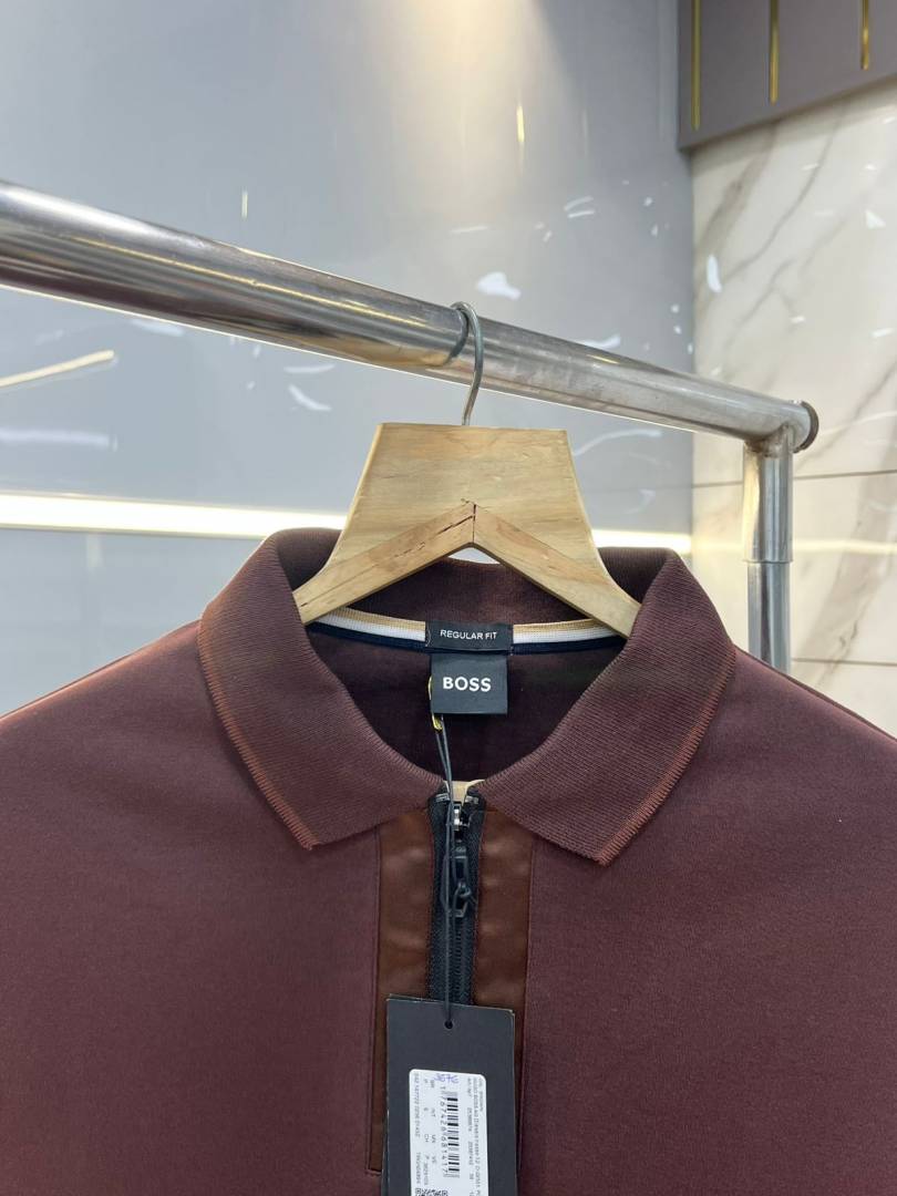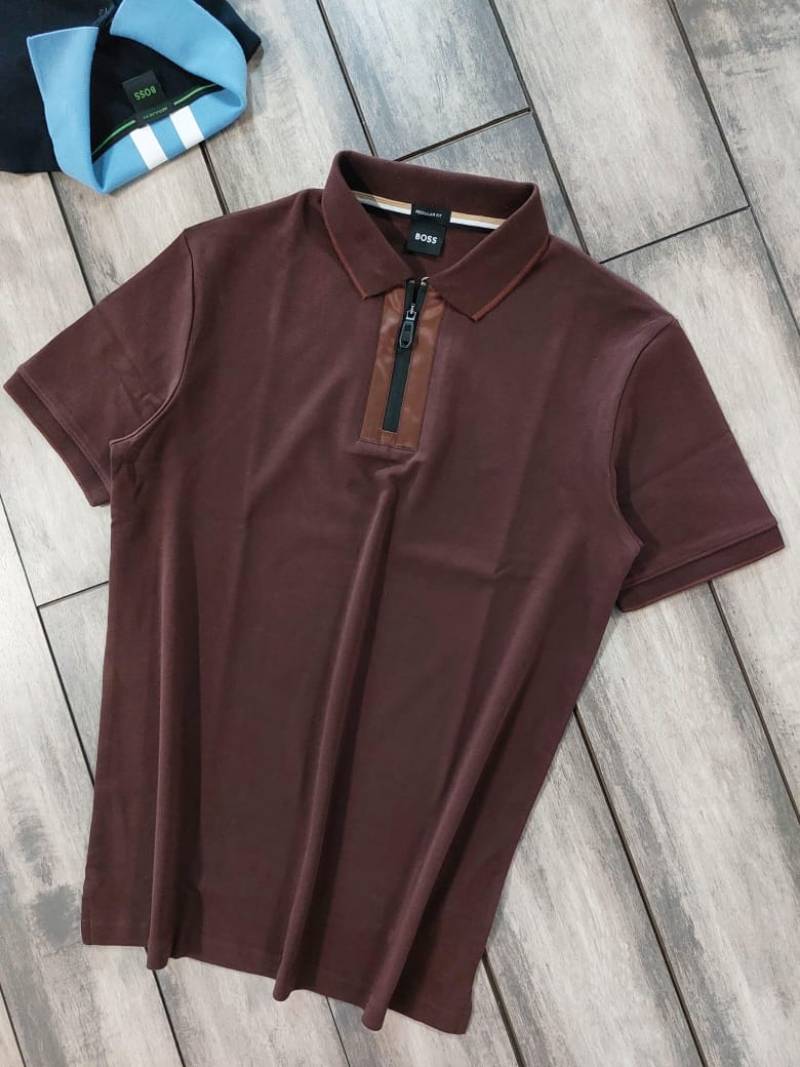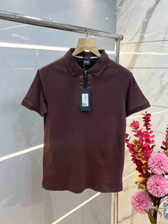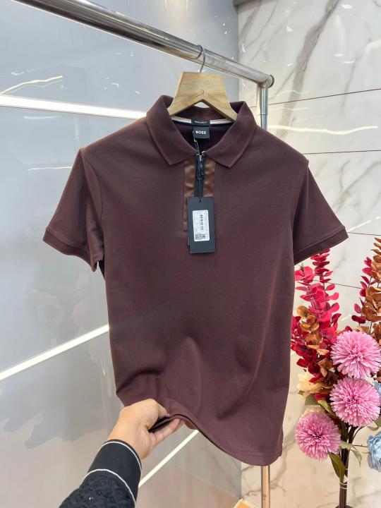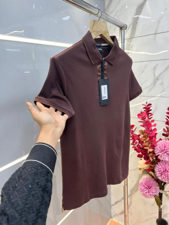 Hugo Bos s Brown Premium Imported Compact Yarn 240 GSM Interlock Fabric Polo Tshirt with Front Design and Emboss Logo Zip Style 3676