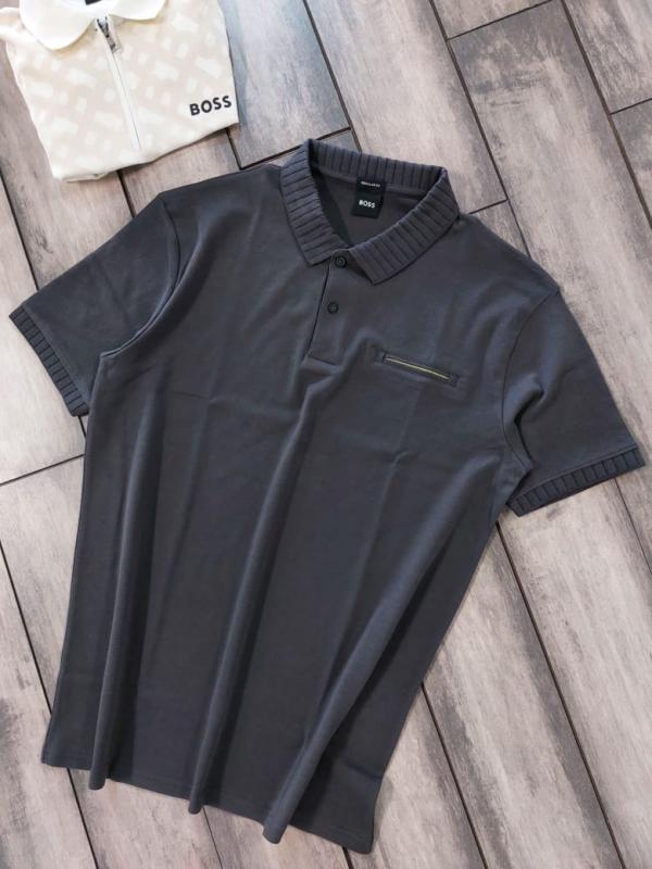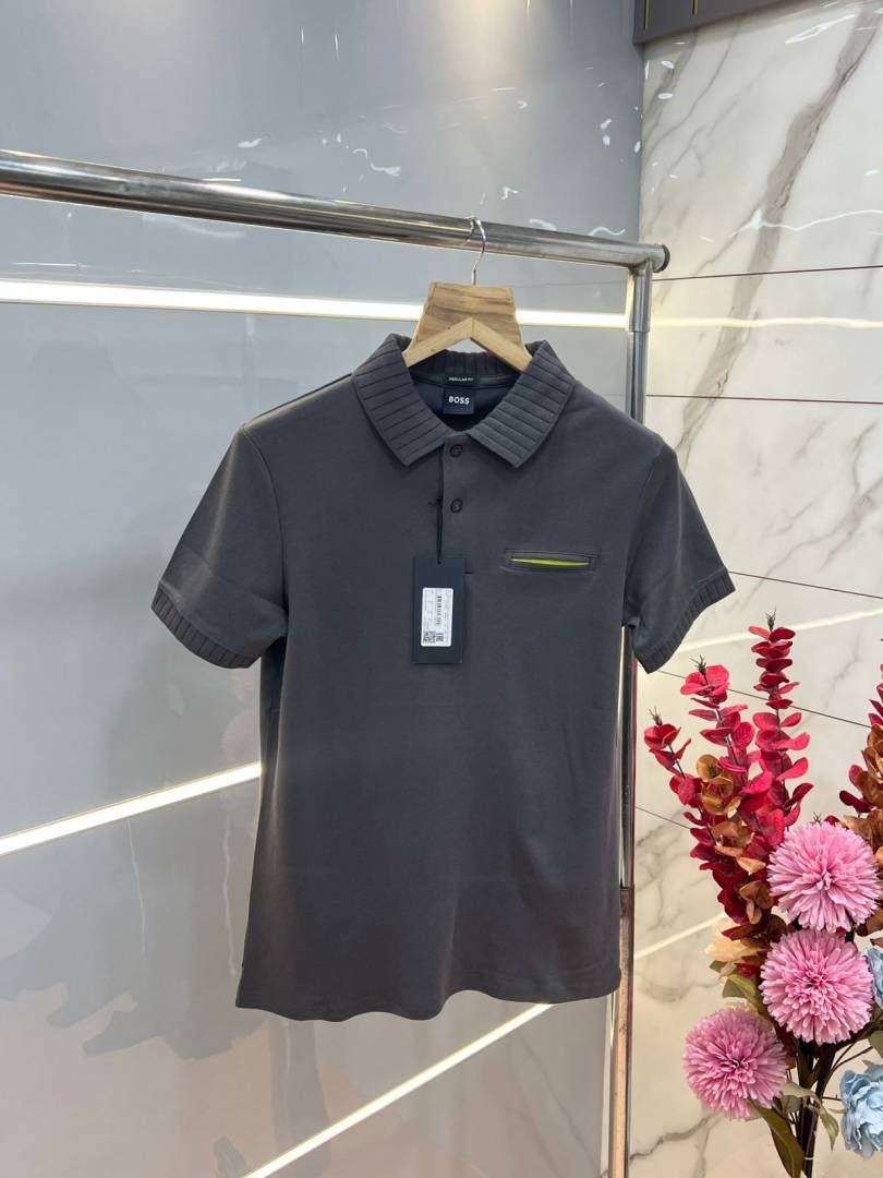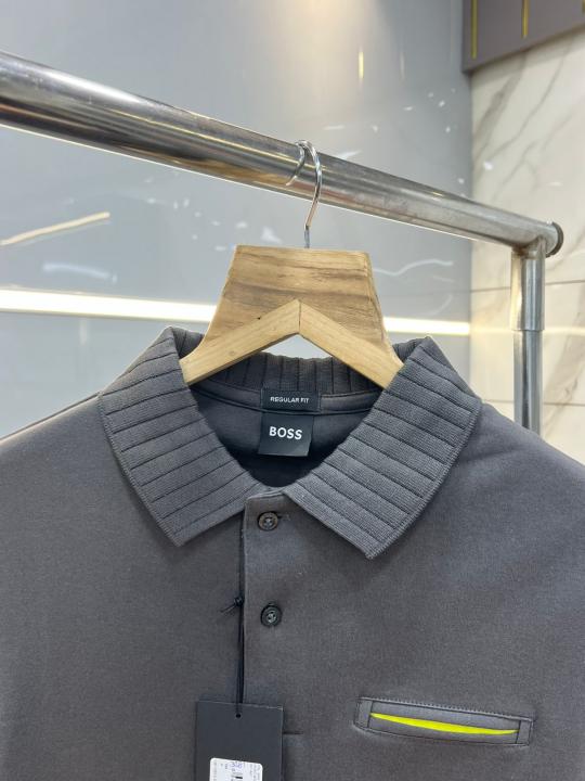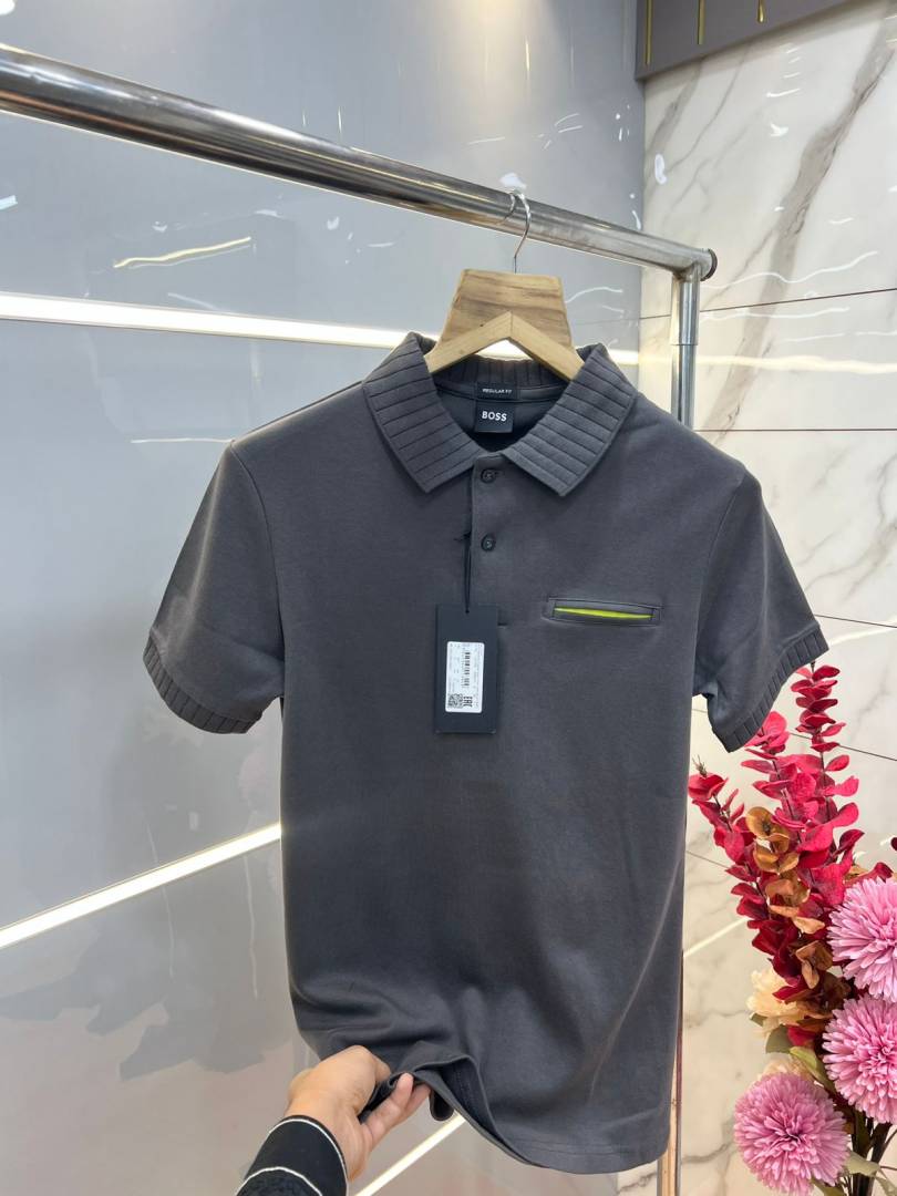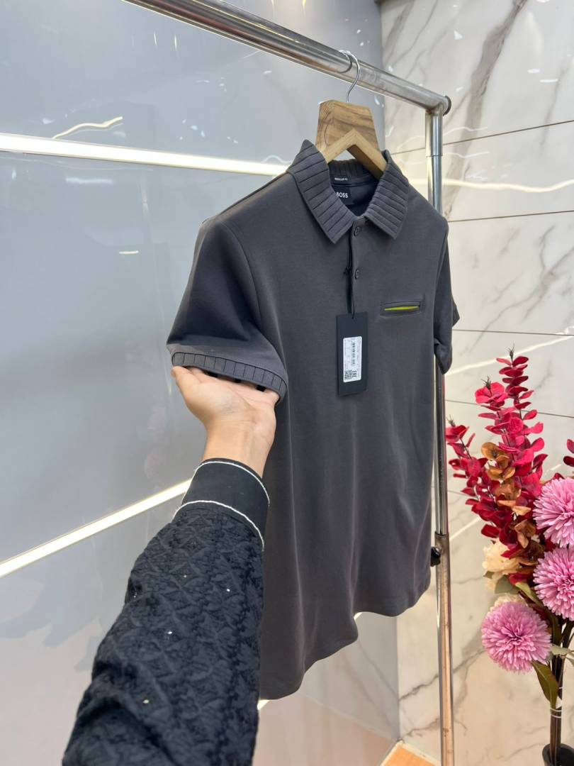 Hugo Bos s Grey Premium Imported Compact Yarn 240 GSM Interlock Fabric Polo Tshirt with Collar Design and Pocket Style 3681